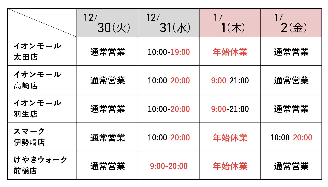 各店舗ページでも、年末年始期間中の営業時間をご案内しております。ご来店を心よりお待ちしております。